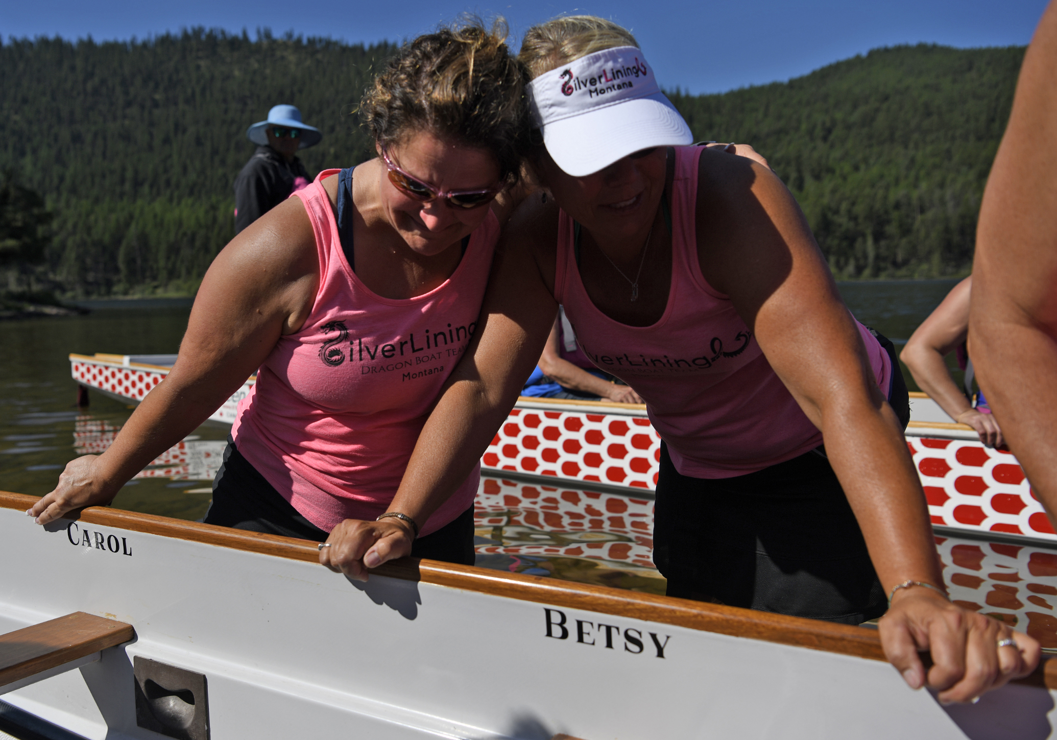Trish Lingle, left, and Heidi Call share a moment during the traditional rose ceremony at the annual Montana Dragon Boat Festival in Bigfork last weekend. Survivors threw pink roses into the water from their boats to remember those they lost to cancer.