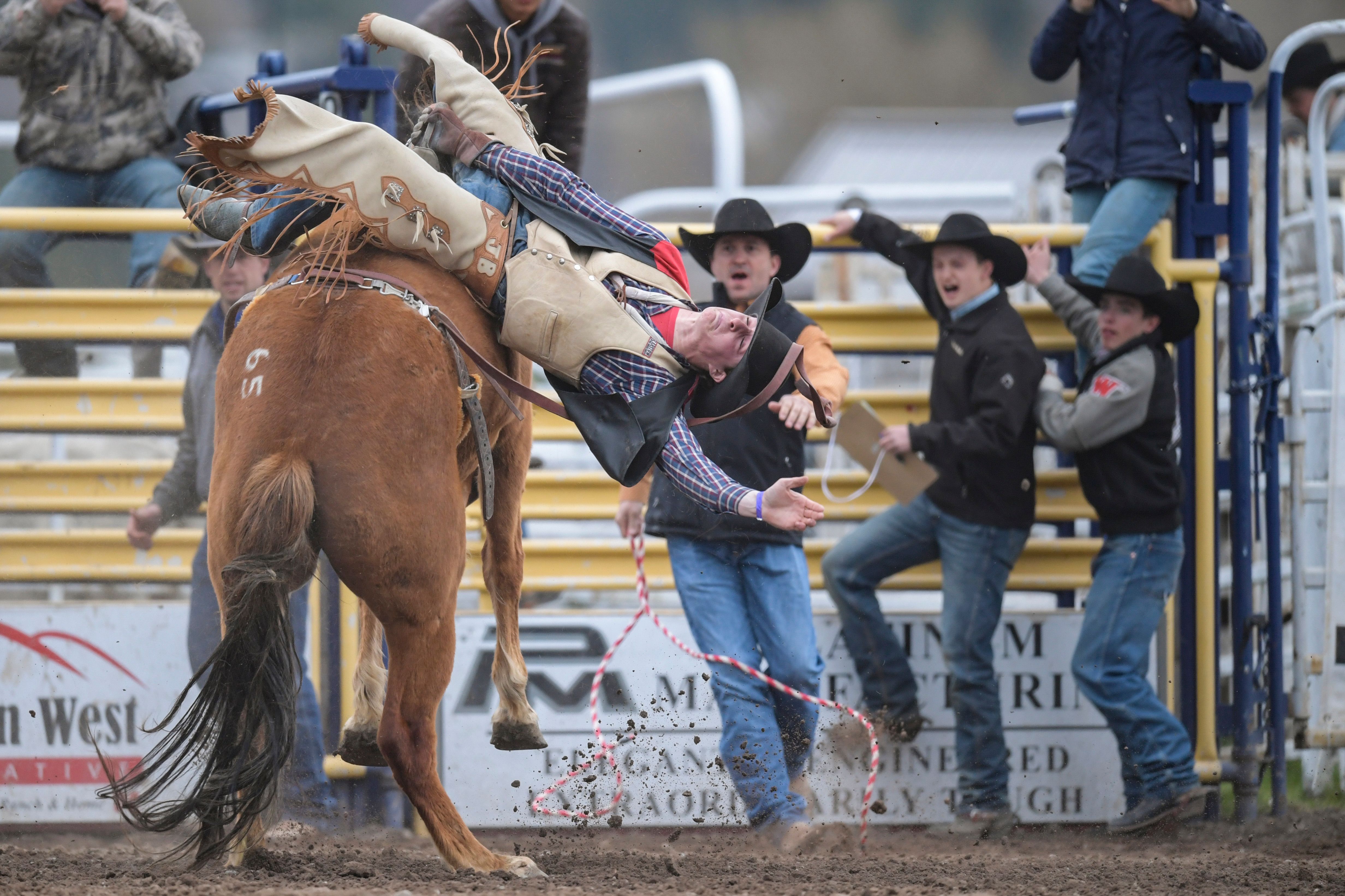 Bareback rider Trevor Kay of the University of Montana Western rides during a college rodeo hosted by the University of Montana on April 30, 2022 in Missoula, Mont.